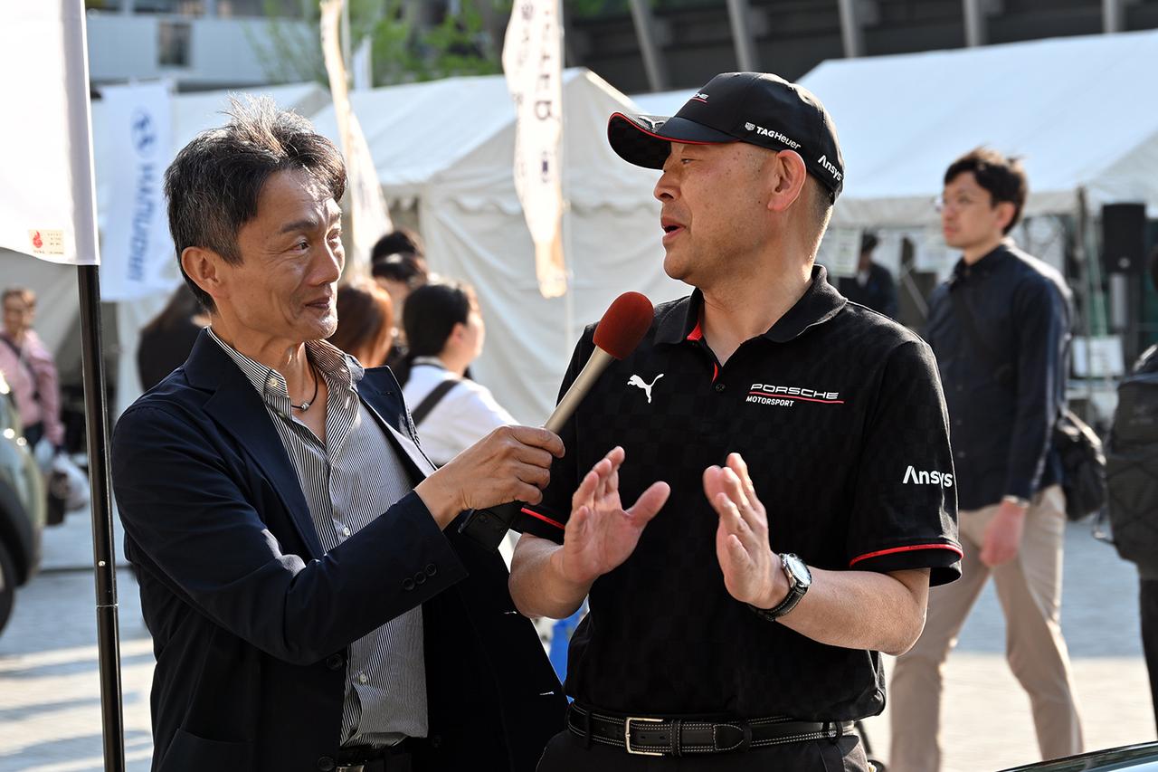 会場レポーターの岡本氏、左はポルシェプロの山本氏。
